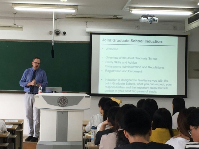 作为开云188-格拉斯哥大学联合研究生院学术院长,Chris Carman教授首先介绍了格拉斯哥大学悠久的历史及其校园环境,联合研究生院的发展历程及其办学特色,并向全体新生系统详细地介绍了联合研究生院的课程设置、学术科研、学习方法以及学生守则, David Forrest 教授就课程形式、学分制度及课程要求进行了详细的解读,使新生充分深入地了解联合研究生院的具体情况以及尽快为今后的学业做好准备。Chris Carman教授还表示,格拉斯哥大学高度重视该项目, 并将继续与开云188一道,将该项目办的越来越好, 争取为同学们提供更优质的教学服务。引导课程结束后, Carman和David对学生提出的问题进行了耐心详细地解答。