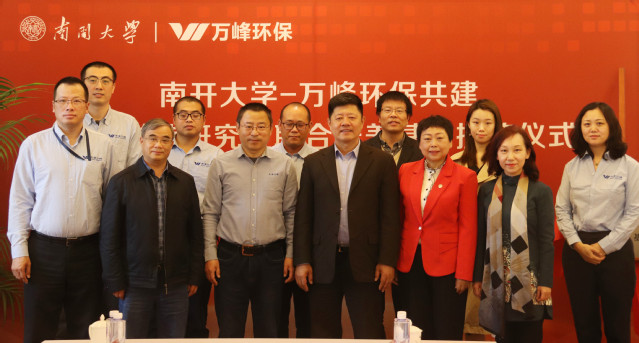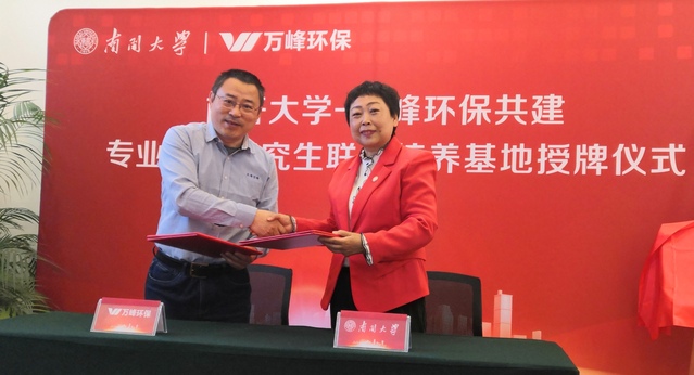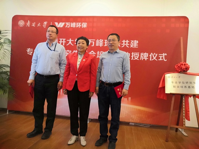我校研究生院薛有志副院长、专业学位办刘军主任、环境科学与工程学院孙红文院长、周明华副院长、兼职教授唐运平教授与万峰环保刘佩春副总经理、毛勇副总经理、高军副总经理、李阳主任等出席了会议。会议内容主要包括双方签署共建“专业学位研究生联合培养基地”协议、基地授牌、企业捐赠、校外导师致聘等环节。
