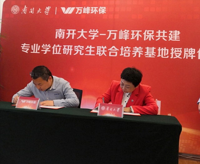 万峰环保刘佩春副总经理与我校环境科学与工程学院孙红文院长签署《开云188与天津万峰环保科技有限公司共建“专业学位研究生联合培养基地”协议书》。
