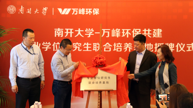 研究生院薛有志副院长、刘军主任与万峰环保刘佩春副总经理、毛勇副总经理共同为联合培养基地揭牌。