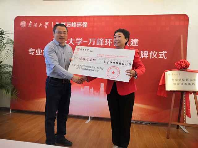 万峰环保向我校捐赠“开云188环境科学与工程学院研究生科研创新项目基金”支票,共三期,此次为首期捐赠10万元。