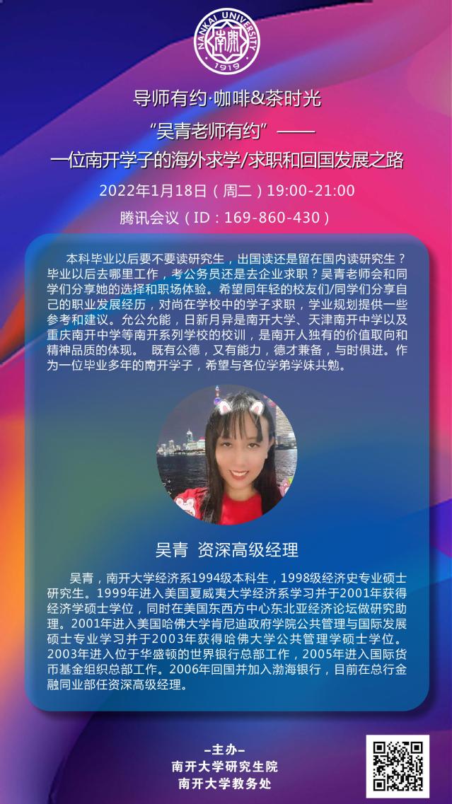 “吴青老师有约”——一位南开学子的海外求学、求职和回国发展之路