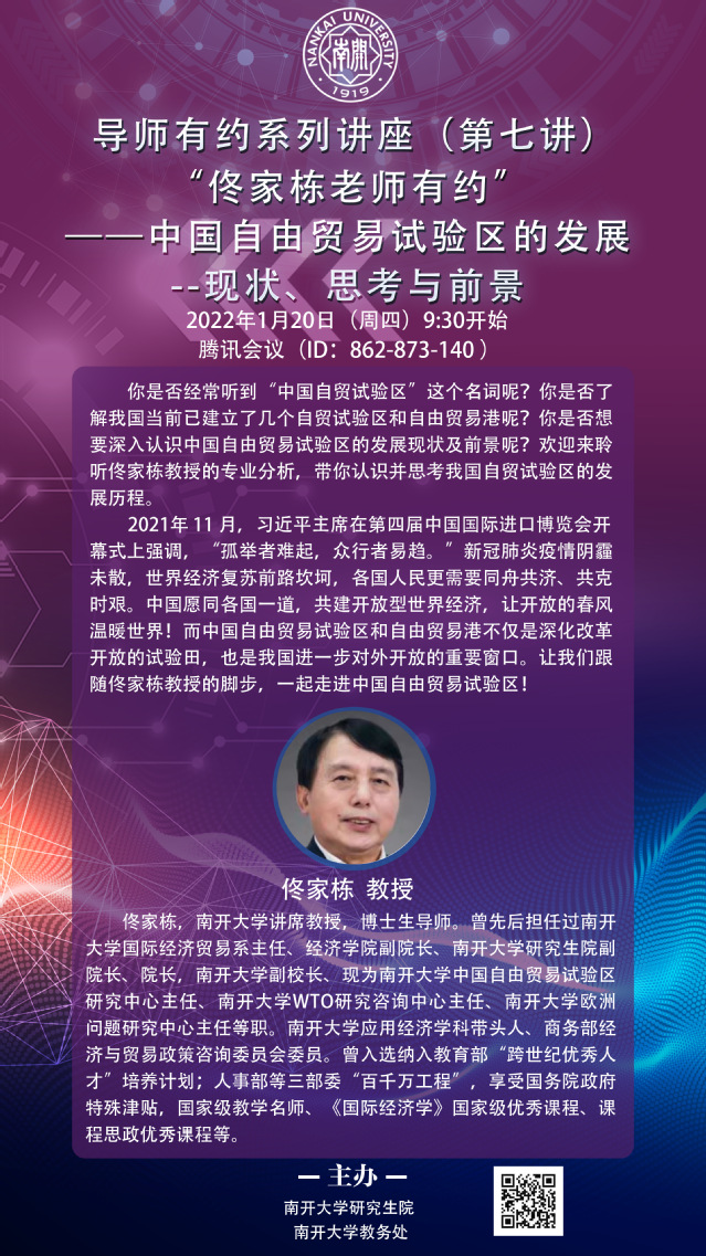 导师有约系列讲座(七)——佟家栋老师有约——中国自由贸易试验区的发展—现状、思考与前景