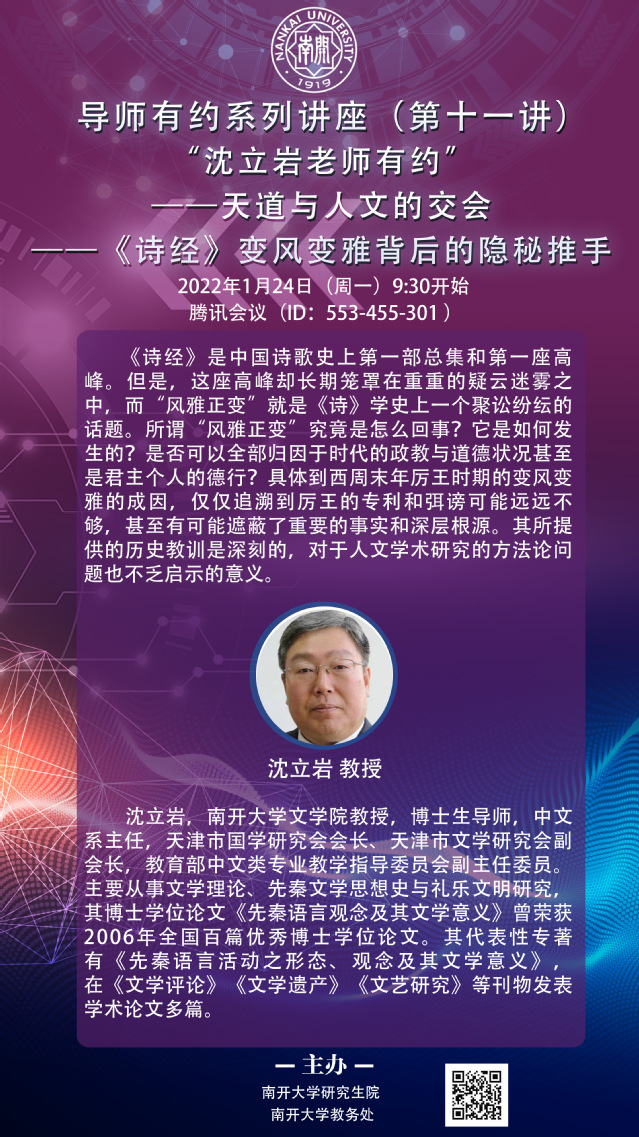 导师有约系列讲座(十一)——沈立岩老师有约——天道与人文的交会《诗经》变风变雅背后的隐秘推手